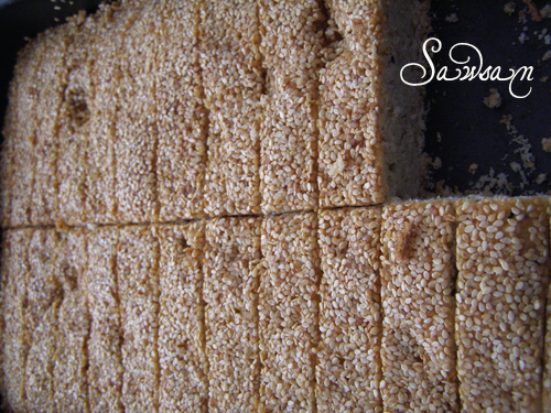 spread a couple of tablespoons of honey on the top. This will do 3 things: give flavour , act as glue to stick the sesame seeds and give the top great color