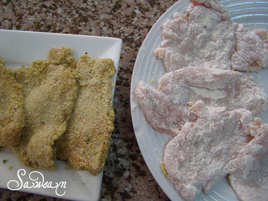 Add the chicken to the flour mixture. Coat then shake off extra flour. (The chicken covered in bread crumbs is for another recipe coming soon)