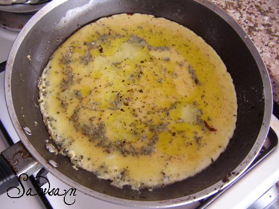 Now the secret to a great omlette is to add the eggs while the pan is hot, keep the flame high till the edges start to set (this takes a minute or two), now lower the heat to the lowest level and cover the pan.