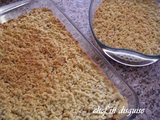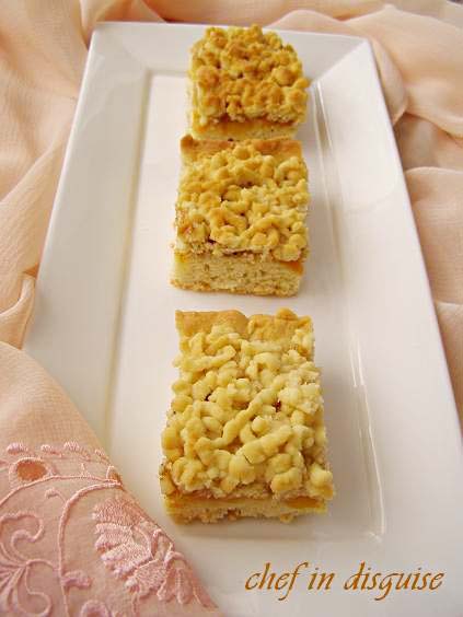 These bars are one of my favorite cookies of all times. The hint of spices, the delicious  jam and the crunch of the base and the top..in one word YUM. This recipe is my mum’ and it reminds me of my childhood. Mum used to let me spread the jam and grate the topping and I used to sit by the oven door and watch them puff up and be mesmerized by the smell of the cinnamon and orange.