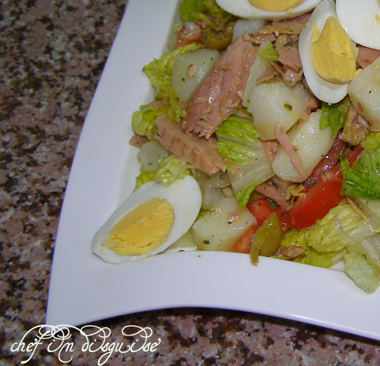 Toss the lettuce, green beans,tomatoes, olives, tuna and potatoes together.