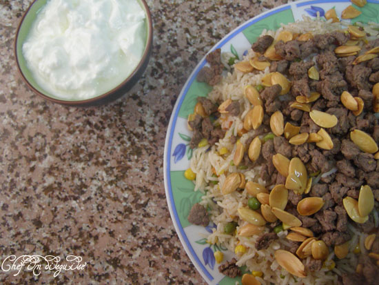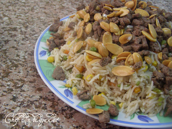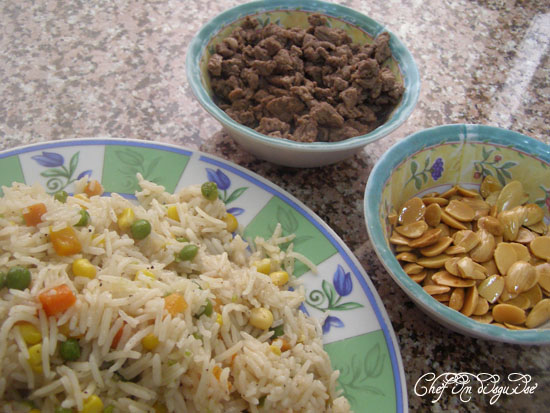 Today’s recipe is simple, quick, colorful and delicious… you can make it without the meat and you’d get a yummy vegetarian recipe. I sometimes make it when I have leftover rice and it works like a charm for a quick meal. Dress it up with meat and almonds and it is transformed into an elegant dish worthy of being served to company.