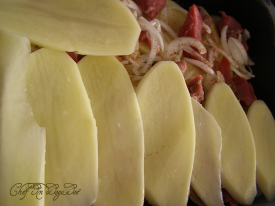 Layer your potatoes on top of the tomatoes then the meat and onions.
