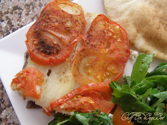 Start by layering your pan with a layer of tomatoes. (Cover the bottom of the pan with a single layer).