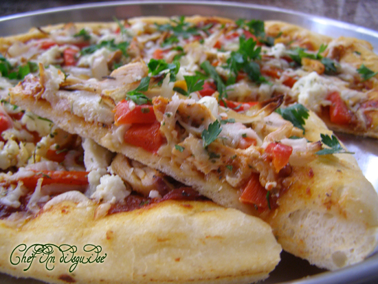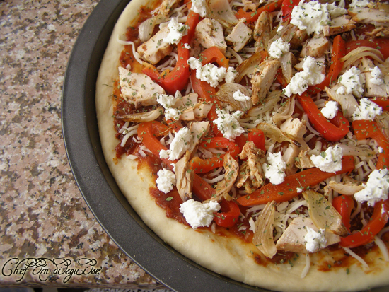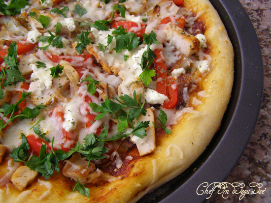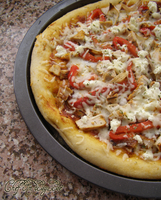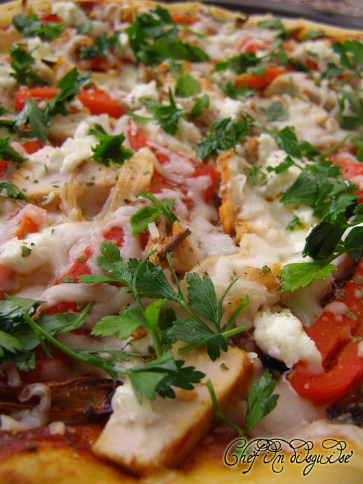The other change I made was to add roasted garlic chicken I had left over(will post the recipe for that some day). It complemented the other flavors of the topping beautifully but you can definitely make the pizza without it.