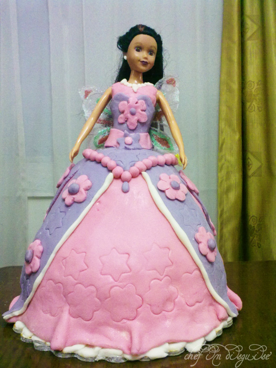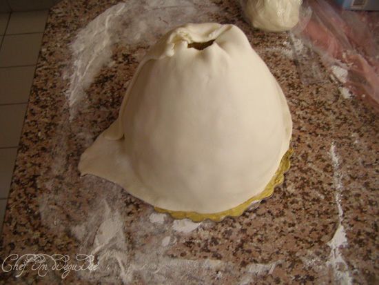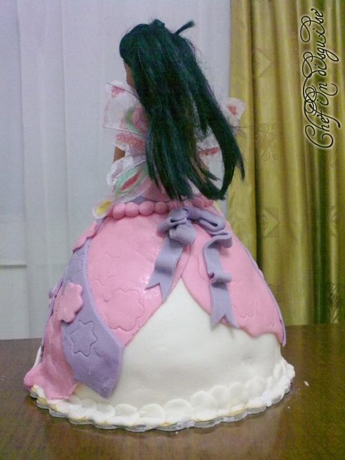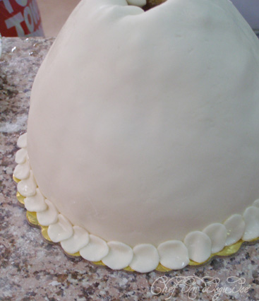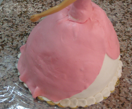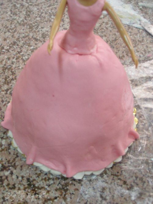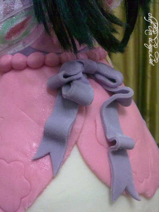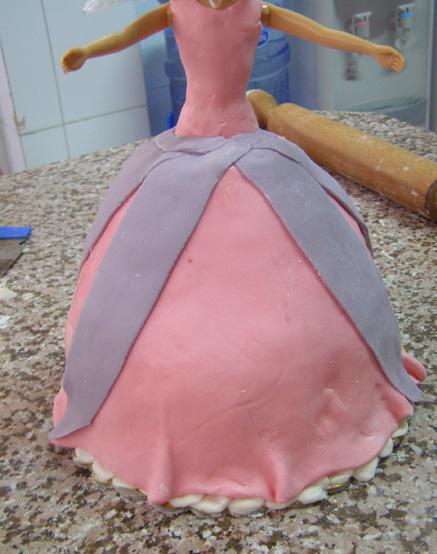 Cut the back part to form the back of the dress and flute the lower edge of the pink fondant as you can see in the pictures.