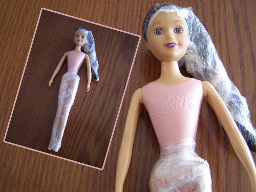 Cover the doll you choose with cling film, you need to cover her hair and her legs. My daughter chose a toy that carries her name Jana 🙂