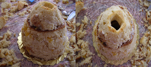 then brush the bottom layer with some juice. The juice helps keep the cake moist and adds flavour. You can use simple syrup or the liquid that comes in the can of fruits (if you use fruits to stuff the cake).