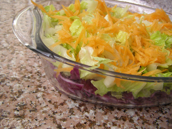 This salad is colorful, healthy and crunchy. You can make this ahead of time, prepare your dressing, layer your salad in the serving bowl and forget about it untill it is time to serve it .