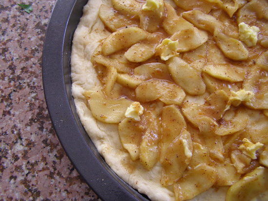 Brush the crust with melted butter. If there’s any butter left, drizzle it over the apples.