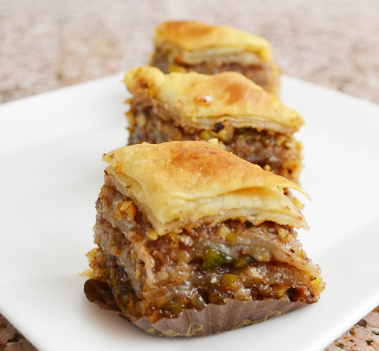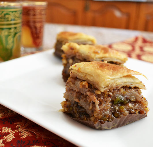 The filling I used was a combination of walnuts, pistachio and hazelnuts, I cut down the sugar in the filling to 2 tablespoons and I added 1 tablespoon of rosewater to the filling. I also added rosewater to the syrup. Other than that I stuck to the recipe.