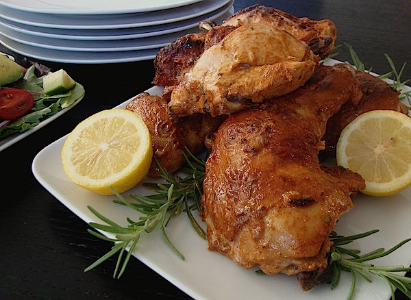 In a large ovenproof deep-sided dish, add yogurt, fresh rosemary, garlic, lemon juice, and paprika. Mix well to combine, further adding salt and black pepper to taste. Save three tablespoons of the marinade to baste the chicken with later (while cooking). Add chicken and coat thoroughly. Arrange the chicken pieces in a single layer, leaving plenty of room in between each piece. Cover and refrigerate overnight.