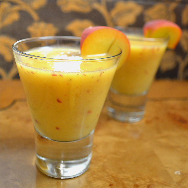 Today’s drink is one we call sunset in a glass in my house. The name comes from the fact that I like to keep the skins on the peaches and when you blend them with the bananas and oranges, the whole glass becomes a warm orange color with specks of red. This fruity drink is not only looks nice, it tastes heavenly, it is healthy and super easy to make.