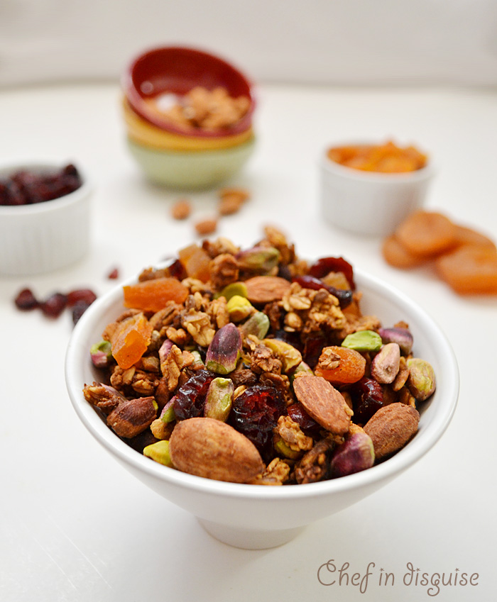 Speaking of beginnings, my favorite way to start the day is with a bowl of granola and some milk or yogurt. Homemade granola is really easy to make, tastes a lot better than anything you can buy, it is much cheaper that anything you can buy and the best part is, you can make it your own way. You can add the nuts, dried fruits and spices you like and mix and match till you find the perfect blend.