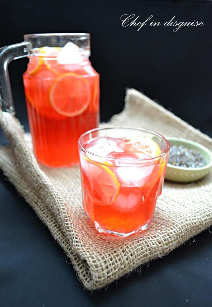 With temperatures soaring above 40, refreshing drinks take center stage in my kitchen.In heat waves like the one we are having I try to provide a variety of home made ,refreshing drinks for my kids and family instead of soda or store bought juices. I have been experimenting lately with lavender . After trying it in a salad dressing and in a marinade for chicken, drinks and sweets were next on the list. So when I saw this lavender syrup recipe on Flavors of the sun I knew I had to try it but I didn’t have blueberries so I replaced them with cherries and reduced the lavender because I wanted it to compliment the delicate cherry flavor not over power it. Next I used the syrup to make lemonade. It turned out AMAZING! The cherries added flavor, sweetness and a beautiful color. The lavender added a breath of freshness and took the lemonade to the next level.