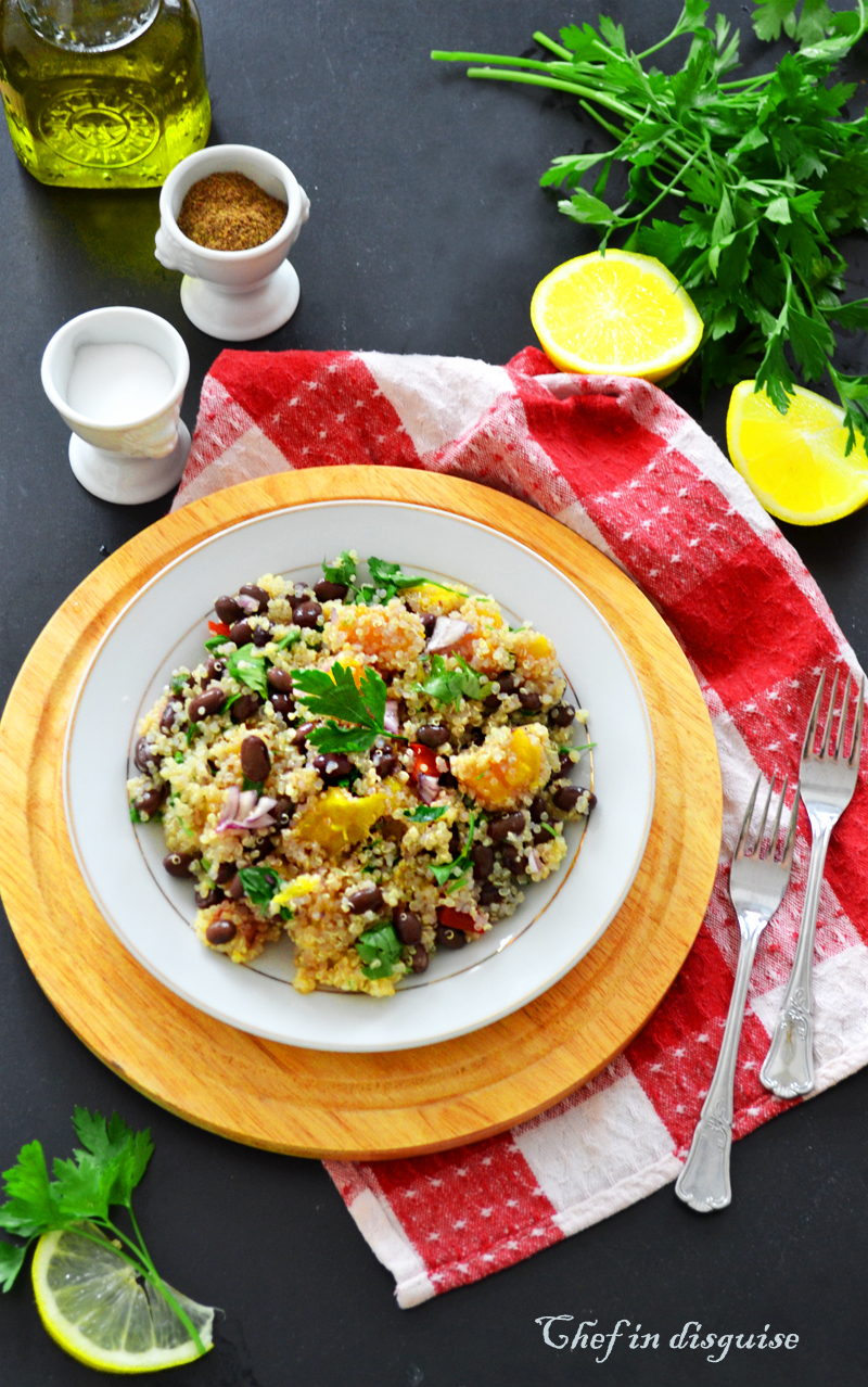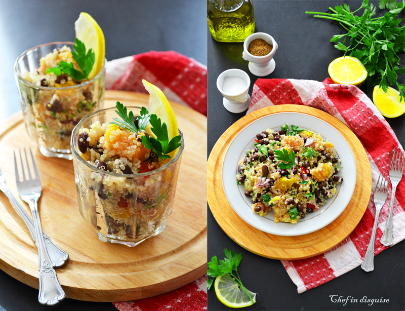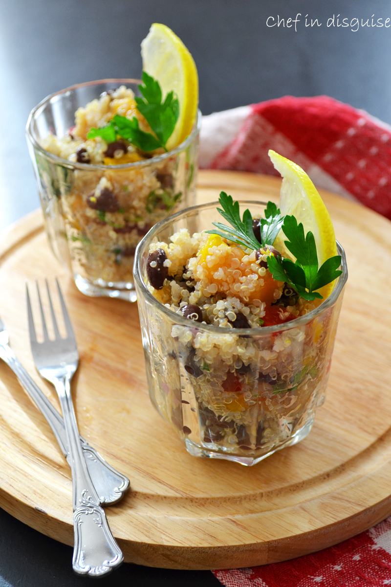 This quinoa salad was a refreshing blast of colors and flavor. The mango and the dressing added a sweet note that was balanced by the lemon juice and the freshness of cilantro. I slightly adapted the recipe by using lemon juice instead of lime and olive oil instead of grape-seed oil and honey instead of sugar for the dressing and I added cilantro to the dressing as well the result was a hit with the entire family.