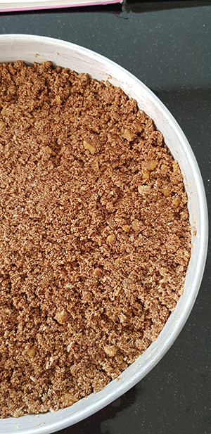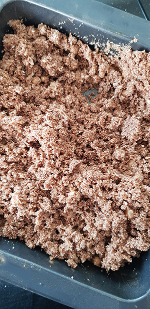 - To prepare the base and topping: Mix the dry ingredients till homogenous, then add in the ghee and rub it into the dry mix with your finger tips