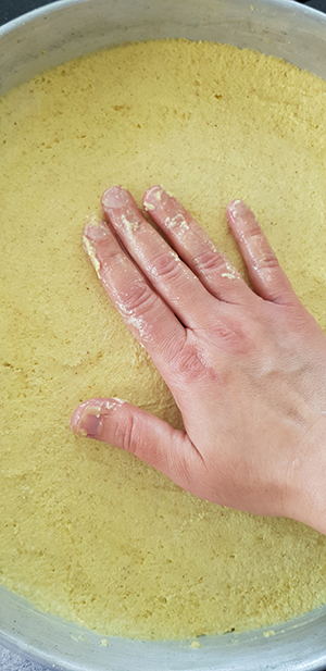 - press it well with the palms of your hands or with a measuring cup. This step is important to make sure that the final dahdah holds its shape and does not fall apart when you cut it