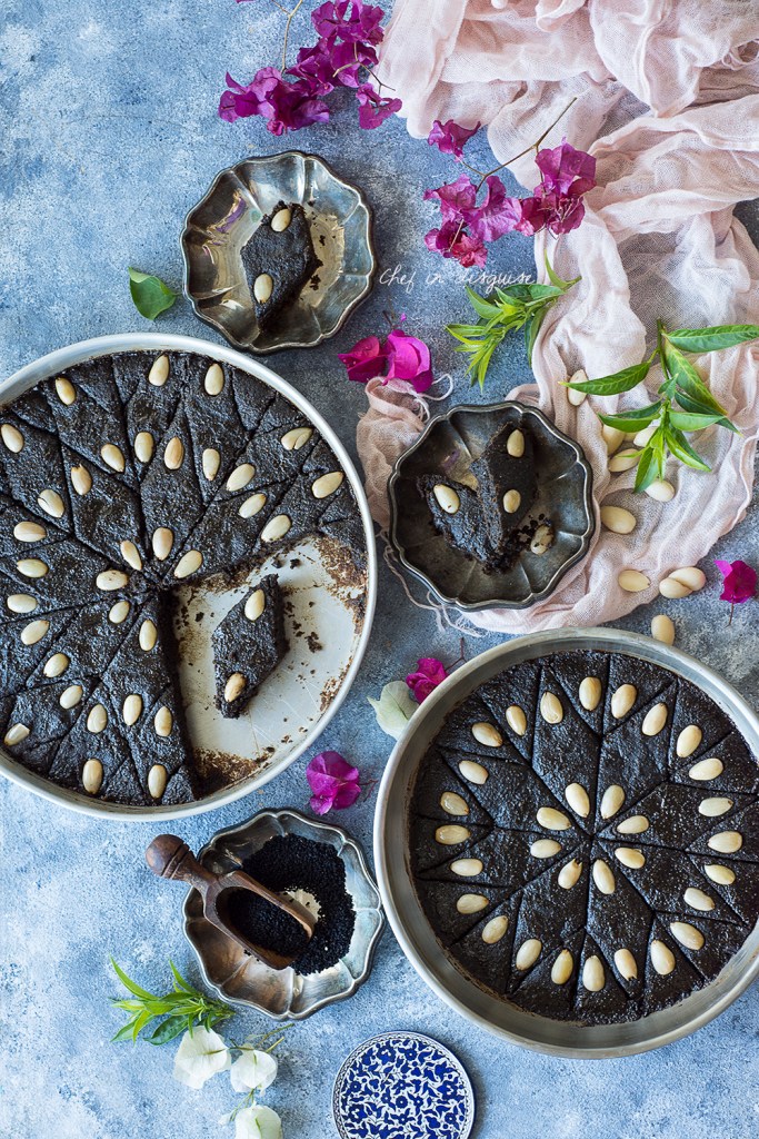 Saniat qizha or the qizha bars you see in the pictures are sort of a very Palestinian brownie if you well! They are soft, rich and moist yet at the same time they pack an intense flavor punch. There is no chocolate here. The black colour is entirely from the nigella seeds paste but the texture, the intensity and the color are indeed reminiscent of brownies .