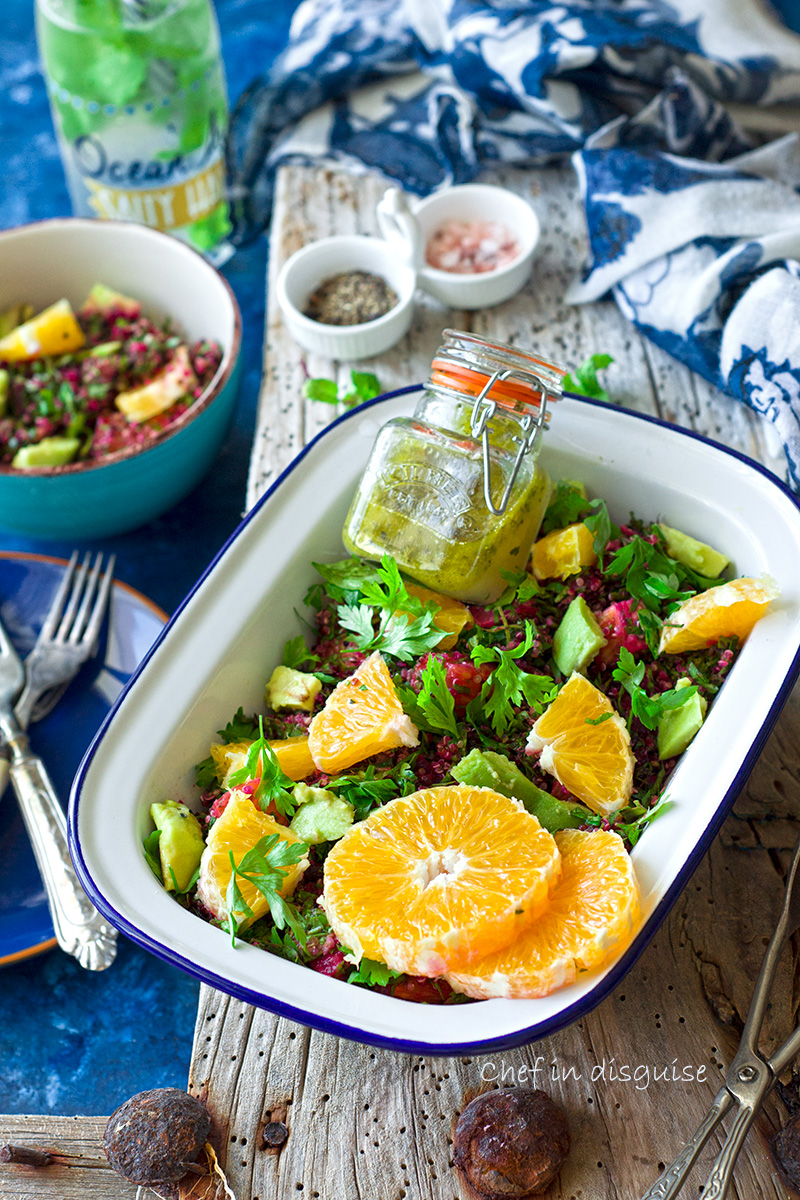 Alternatively, you can place all the ingredients in a jar, secure the lid then shake till the dressing is homogenous. - In a bowl add the quinoa, parsley, beets, avocado and orange segments.