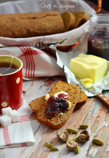 Peperkoek or Kruidkoek is a Dutch sweet quick bread made with a wonderful blend of warming spices like cloves, cinnamon, ginger, and nutmeg. Many recipes also feature succade (candied citrus peel) . Peperkoek is traditionally served at breakfast in Holland with a thick layer of butter on top, as a replacement for regular bread. However due to its sweet taste it is also served as a snack or packed in the kids’ lunch boxes